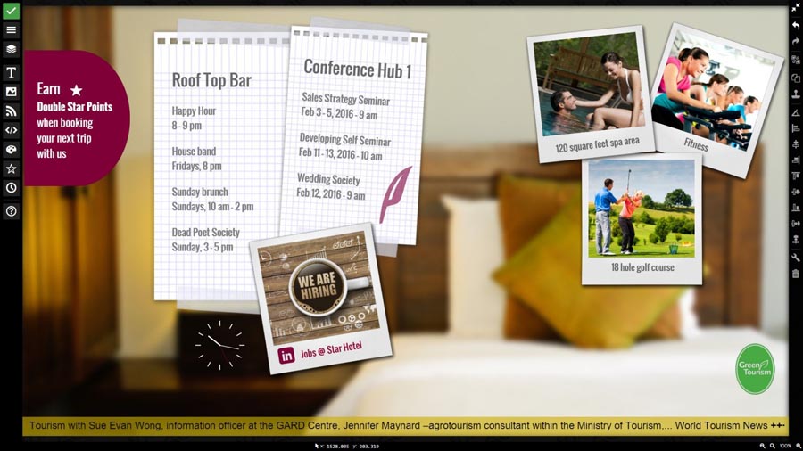 Eigene Hintergrundmotive, Textbausteine und Bilder lassen sich so zum ganz individuell gestalteten Content für das innovative schwarze Brett ausarbeiten. Auch Webseiten und RSS-Feeds können problemlos eingebunden werden, um Informationen an den Betrachter weiterzugeben.