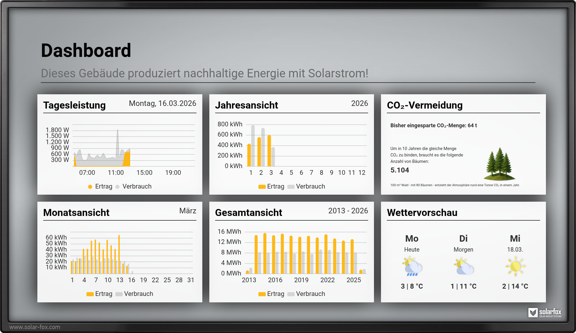 Zeigt eine Monatsansicht des Stromertrages und optional den Stromverbrauch des Gebäudes