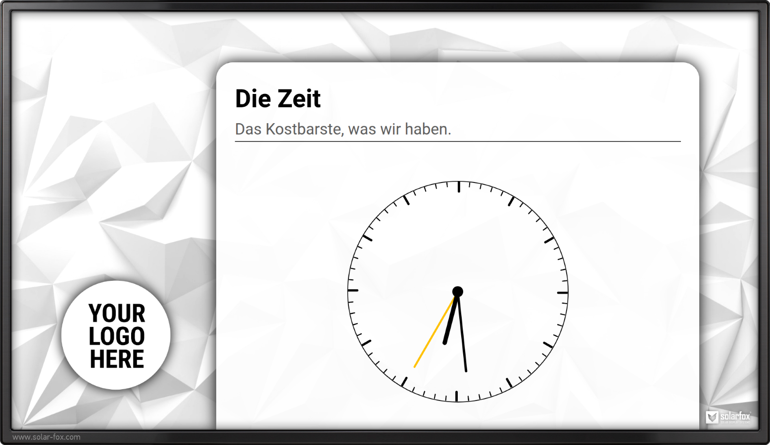 Ansicht zur Begrüßung von Besuchern mit Name, Logo, Raumangabe und Uhrzeit
